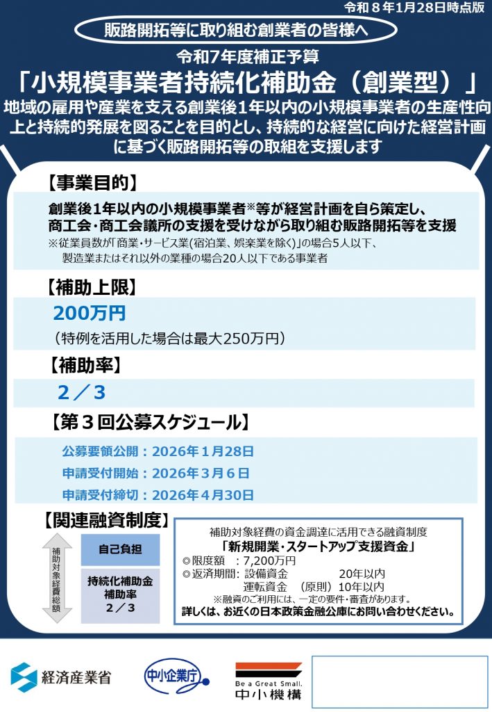 地域の小規模事業者の皆様の販路開拓等を支援する「小規模事業者持続化補助金」について、最新の公募要領が公開されましたのでお知らせいたします。