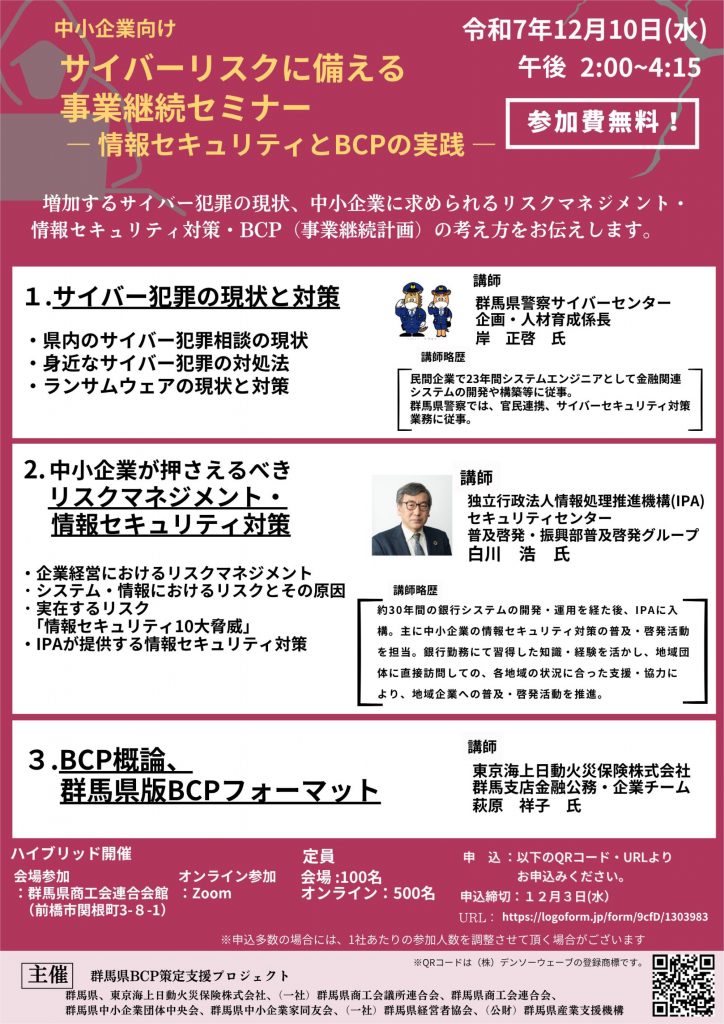 群馬県BCP策定支援プロジェクト主催による標記セミナーのご案内です。